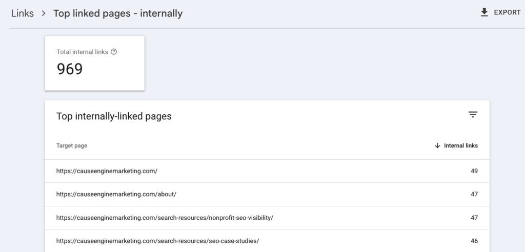 There are many paid SEO tools out there that can help you see what pages have the most to least existing internal links, but a free option that we use often at Cause Engine Marketing is Google Search Console. If you have one set up for your website (and we highly recommend that you do that if not), head over to “Links” in the left-hand sidebar.