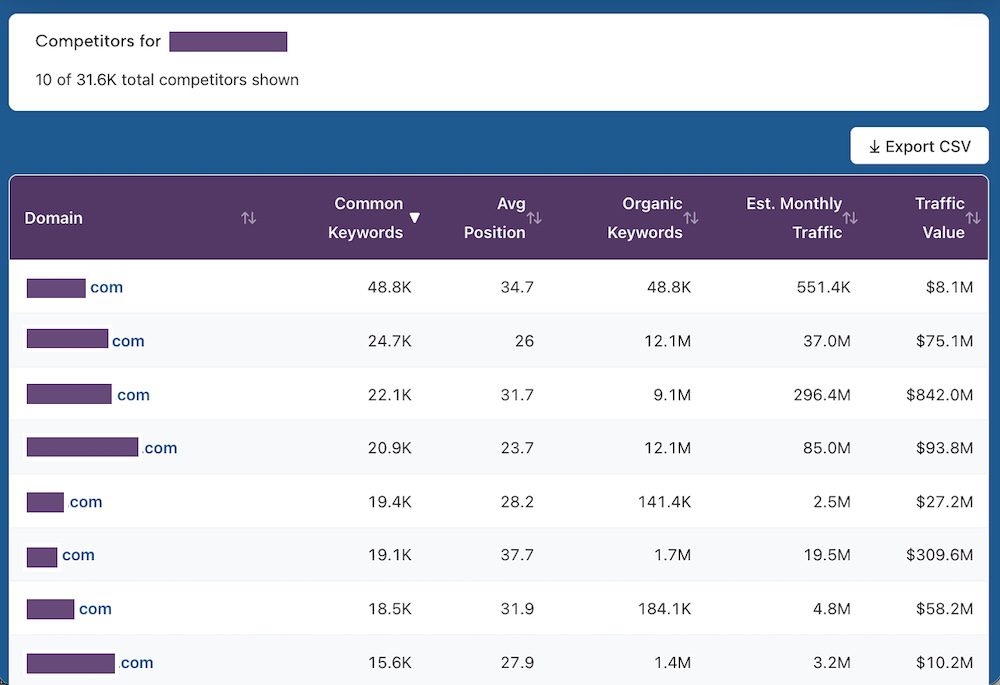 - Competitor Finder – Enter your domain and discover the top 10 websites competing for the same keywords you do, based on actual keyword overlap in Google’s results. See common keyword counts, estimated traffic and visibility scores.
