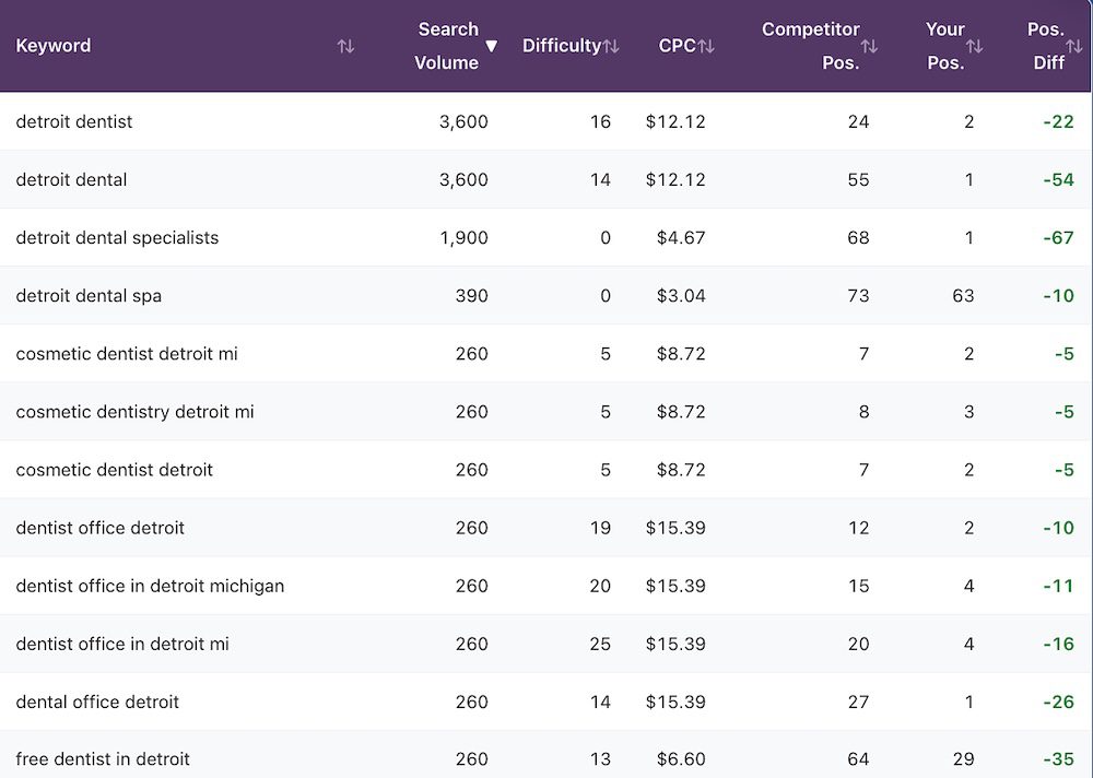 - Keyword Gap Tool – Compare your domain against any competitor and see keywords they rank for that you don’t, or where they significantly outrank you. Includes search volume, difficulty and their current ranking position for each keyword. Filter by difficulty to find the opportunities you can realistically win.