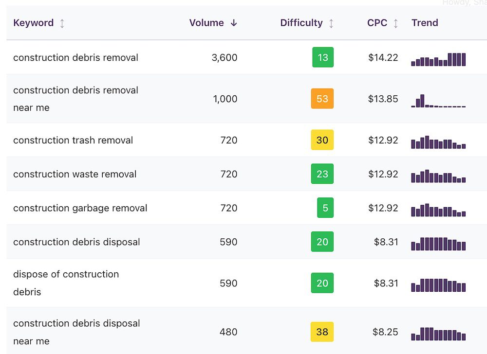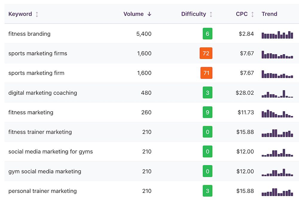 - Keyword Research – Enter up to 250 keywords in a single batch to get monthly search volume, keyword difficulty (0-100), cost-per-click and trend data for each search term. You can sort, filter and export this data as a CSV file to take your findings with you.